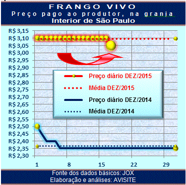 O que irá acontecer nestes 14 dias faltantes para o encerramento de 2015 é uma incógnita, mesmo porque não estão sendo divulgados números de produção. Sabe-se, apenas (informação oficiosa), que após grande alta em outubro, a produção de pintos de corte apresentou sensível recuo em novembro. E se isto for verdadeiro, as duas próximas semanas, bem como as duas primeiras de janeiro de 2016, terão menor oferta de aves vivas para abate.