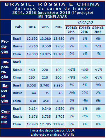 O Departamento de Agricultura dos EUA (USDA) acaba de divulgar suas primeiras projeções acerca das tendências da carne de frango do próximo exercício (2016) em três dos cinco BRICS, a saber, Brasil, Rússia e China.