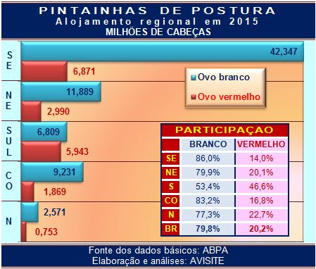 Quase 80% do volume total alojado esteve representado por pintainhas produtoras de ovos brancos. Mas esse percentual varia significativamente conforme a Região. No Sudeste, sobe para 86% (ou seja, apenas 14% das aves alojadas são produtoras de ovos vermelhos). Já o extremo oposto ocorre na Região Sul, onde as pintainhas produtoras de ovos vermelhos corresponderam a 46,6% do total alojado na Região.