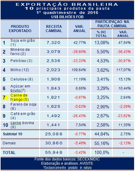 Notar, de toda forma, que embora apresentando, ainda, evolução negativa na receita cambial, a carne de frango teve aumentada sua participação na pauta. Assim, o produto gerou receita equivalente a 3,25% de toda a receita obtida pelas exportações brasileiras, o que correspondeu a um aumento de 2,64% sobre os mesmos quatro meses de 2015.