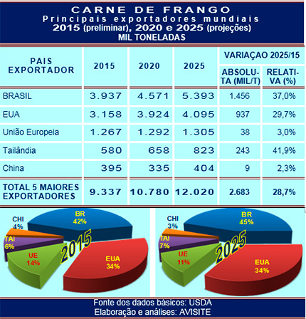 Observe-se que, considerado o volume exportado em 2015 e o previsto para 2025, as exportações norte-americanas terão que crescer, na verdade, acima de 40%, índice superior ao previsto para o Brasil, cuja expansão é projetada em 37%. Isso, porém, não afeta a hegemonia das exportações brasileiras que, pelo contrário, ampliarão sua participação entre os cinco, passando a responder por quase 45% do volume exportado pelo bloco. Aliás, mais da metade do adicional de carne de frango previsto (2,683 milhões de toneladas) será de produto brasileiro.