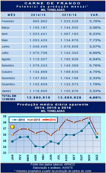Partindo do alojamento de pintos de corte e aplicando sobre ele padrões pré-determinados de produtividade - viabilidade de 96% dos pintos alojados, abate aos 45 dias de idade e peso médio, abatido, de 2,350 kg para o mercado interno e de 1,350 kg para o mercado externo – a APINCO demonstra que a capacidade de produção de carne de frango do primeiro mês de 2016 girou em torno do 1,156 milhão de toneladas, volume que representa aumento de 3,5% sobre o potencial de um ano atrás.