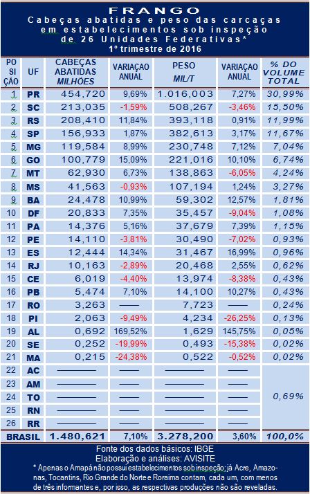 O levantamento do IBGE relativo ao abate de frangos sob inspeção no primeiro trimestre de 2016 aponta que, entre 21 Unidades Federativas (UFs), em apenas oito delas o número de cabeças abatidas sofreu redução em relação ao mesmo período de 2015.