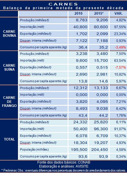 Notar, pela tabela abaixo, que no período analisado o consumo per capita total das três carnes pelos brasileiros aumentou (números arredondados) não mais que 300 gramas. Porém, o aumento no consumo das carnes suína e de frango foi de 1.600 gramas, metade para cada uma delas.