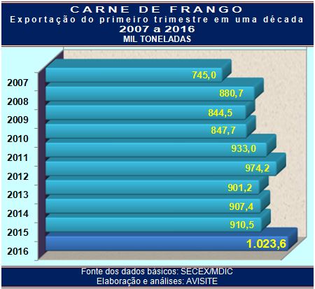 Ao alcançarem, nos três primeiros meses de 2016, pouco mais de 1,023 milhão de toneladas, as exportações brasileiras de carne de frango aumentaram perto de 12,5% em relação ao mesmo trimestre de 2015.