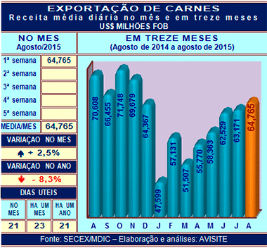 Sob esse, aspecto, aliás, os dados da SECEX/MDIC apontam boas perspectivas para, pelo menos, duas carnes, a suína e a de frango. Esta última iniciou o mês embarcando volume que, projetado para a totalidade dos 21 dias úteis de agosto, sugere expansão próxima de 20% em relação a agosto de 2014. Já a carne suína sinaliza embarques mais de 40% superiores aos de um ano atrás.