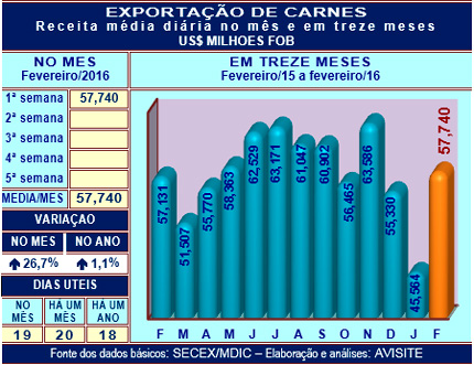 Na primeira semana de fevereiro (1 a 6, cinco dias úteis), a receita obtida subiu – pela média diária – para US$57,740 milhões, valor que significou aumentos de 26,7% e 1,1% sobre, respectivamente, o mês anterior (US$45,564 milhões em janeiro/16) e o mesmo mês do ano passado (US$57,131 milhões em fevereiro de 2015).