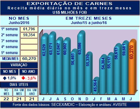 Na segunda semana de junho (5 a 11, cinco dias úteis) a receita cambial das carnes sofreu ligeiro refluxo em relação à semana anterior, o que é natural. Mesmo assim permaneceu com o melhor resultado dos últimos sete meses.
