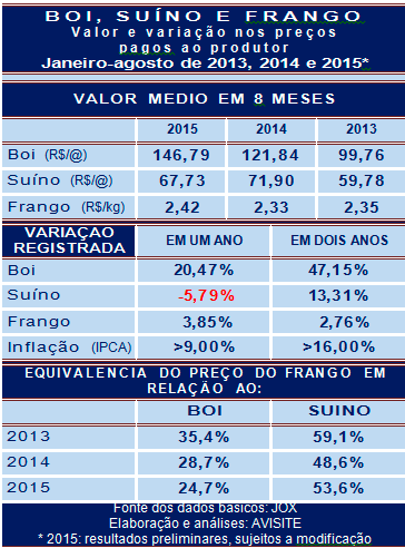 Desempenho de boi, suíno e frango vivos nos 8 primeiros meses de 2015