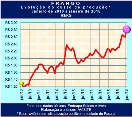 O levantamento mensal da Embrapa Suínos e Aves aponta que em janeiro passado o custo de produção do frango ficou em R$2,8019/kg, valor 24% superior ao registrado em janeiro do ano passado.