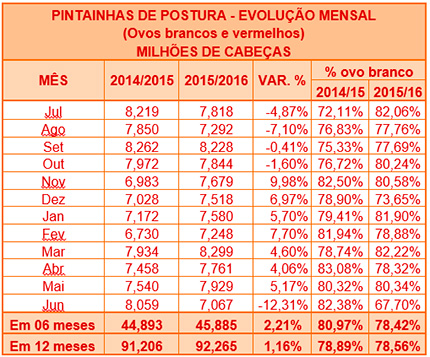 A maior redução aconteceu no volume de pintainhas de postura para produção de ovos brancos que ficou em torno de 80% na média dos primeiros cinco meses de 2016 e, em junho, caiu para menos de 68%.