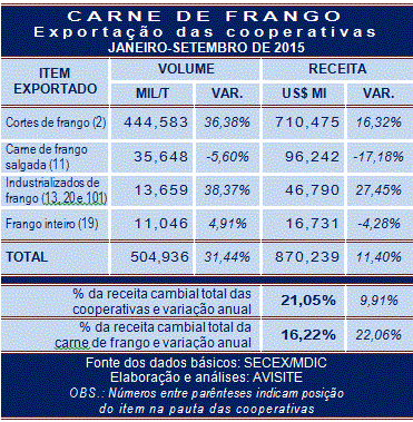 Os dados da SECEX/MDIC apontam que, na exportação de carne de frango, as cooperativas fecharam os nove primeiros meses de 2015 com aumentos de 31,44% no volume embarcado e de 11,40% na receita cambial.