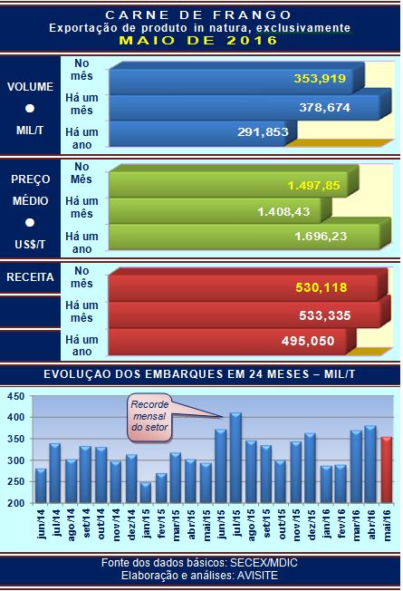 Mesmo não repetindo o bom desempenho de abril, mês em que se atingiu o segundo maior volume da história do setor, em maio (um dia útil a mais) as exportações de carne de frango in natura continuaram apresentando comportamento acima da média.