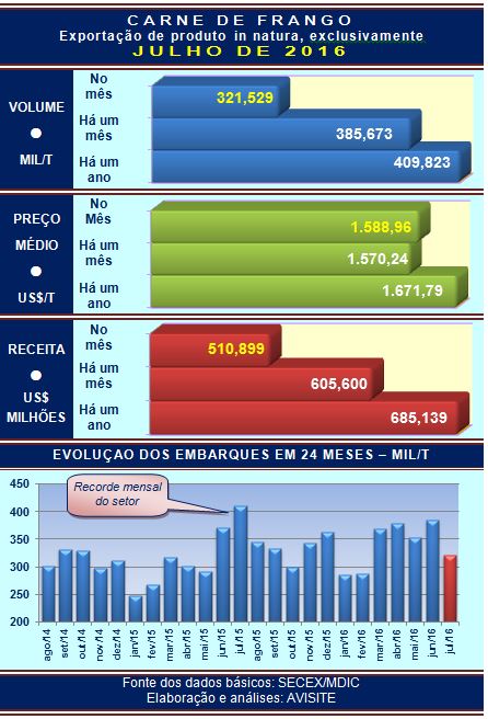 As exportações brasileiras de carne de frango in natura de julho de 2016 ficaram à distância do que foi embarcado um ano atrás – perto de 410 mil toneladas em julho de 2015, recorde mensal até hoje não superado – ou, mesmo, do que foi exportado no mês anterior – mais de 385 mil toneladas, segundo maior volume da história do setor.