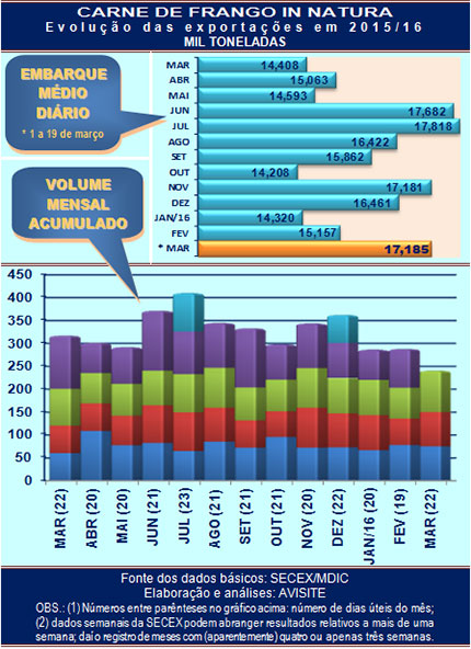 Transcorridos os primeiros 14 dias úteis de março, as exportações de carne de frango in natura somam 240.589 toneladas – perto de 17,2 mil toneladas diárias. Ou seja: mantida essa média nos oito dias úteis restantes do mês, o total de março pode chegar às 378 mil toneladas, volume só inferior – considerado apenas produto in natura – às [perto de] 410 mil toneladas de julho do ano passado.