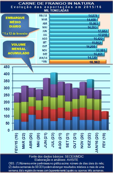 Os resultados divulgados pela SECEX/MDIC são, não há dúvida, alvissareiros. Pois, a partir do volume médio diário embarcado em duas semanas – 16.962 toneladas/dia - conclui-se que na segunda semana do mês as exportações brasileiras de carne de frango in natura superaram a marca das 19 mil toneladas diárias, desempenho raras vezes visto no setor.