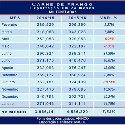 Aliás, feita uma análise do comportamento mensal das exportações brasileiras de carne de frango nos 15 primeiros anos do século XXI (2001 a 2015), é possível constatar que em janeiro ocorrem os menores embarques de cada exercício. Nesse período, o volume exportado no mês equivaleu a 7,1% do total anual. O que, mantida a média, irá conduzir a um total anual da ordem de 4,382 milhões de toneladas em 2016, quase 4% a mais que o registrado em 2015.
