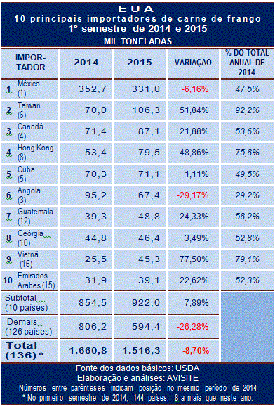 No primeiro semestre de 2015 os dez principais importadores de carne de frango dos EUA aumentaram suas compras em volume próximo de 8%. Tal desempenho neutralizou parcialmente a queda de mais de 25% observada entre os restantes 126 importadores, fazendo com que a primeira metade do corrente exercício fosse encerrada com redução de apenas 8,7%.