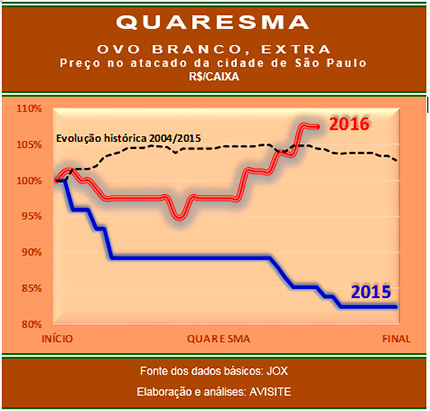 Acompanhamento realizado pelo Ovosite no período da quaresma indica que os aumentos alcançados pela caixa de ovos na semana passada alteraram fortemente os índices de evolução alcançados em relação ao ano anterior ou ao período histórico levantado.