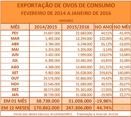 Nos últimos 12 meses – fevereiro de 2015 a janeiro de 2016 - o setor de postura comercial exportou 247,3 milhões de ovos, superando em quase 45% os embarques do mesmo período imediatamente anterior. Entretanto, representa somente dois terços do que foi embarcado nos doze meses do já distante ano de 2012.