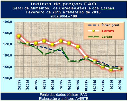 Em fevereiro de 2016 o Índice FAO de Preços dos Alimentos (FFPI, na sigla em inglês) alcançou a marca dos 150,2 pontos, o que significou estabilidade em relação aos preços de janeiro (150,0 pontos), mas recuo de quase 15% em relação a fevereiro do ano passado (175,8 pontos).