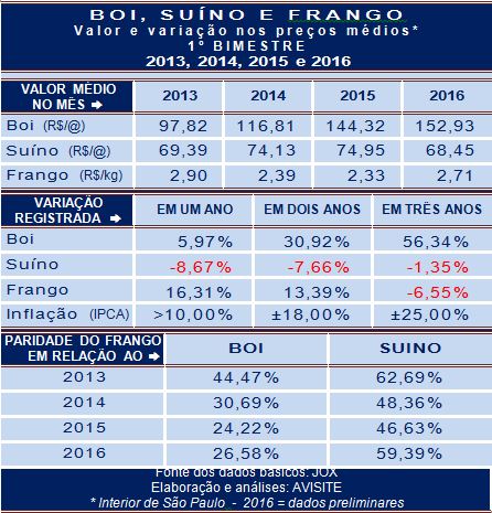 Como está encerrando os dois primeiros meses do corrente exercício com um valor médio 16,31% superior ao de idêntico período de 2015, o frango vivo aparenta estar em melhor situação que o boi em pé, cujo preço, neste ano, anda perto de 6% acima do alcançado no ano passado. E melhor ainda que o suíno, por ora registrando valor médio mais de 8% inferior ao do primeiro bimestre de 2015.
