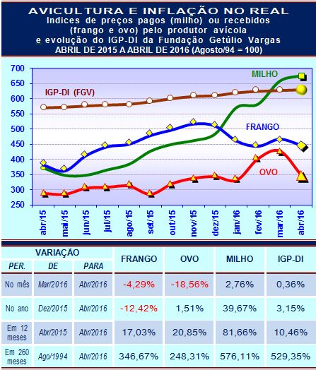 Se persistisse a paridade de preços registrada em 1994 entre os três produtos, o frango vivo teria sido comercializado em abril por R$4,06/kg e o ovo (base: extra branco, no atacado) por R$130,29/caixa. Mas, comparativamente a esses valores, o frango ficou a 66% (R$2,68/kg) e o ovo a pouco mais da metade (R$67,12/caixa).