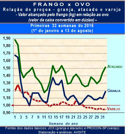 E como só recentemente o frango vivo conseguiu reajustar suas cotações, nas primeiras 32 semanas de 2016 (de 1º de janeiro a 13 de agosto) seu preço médio ficou apenas 17% acima do alcançado pelo ovo.