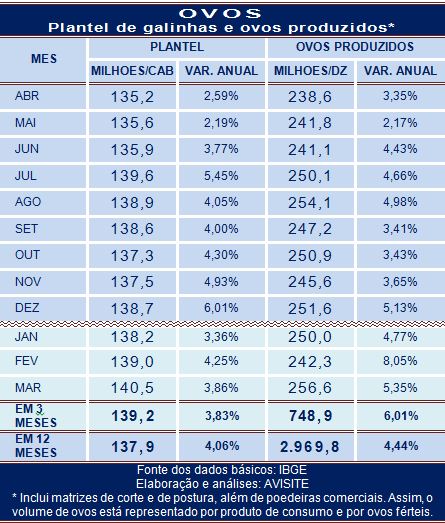 Os dados preliminares do IBGE relativos ao primeiro trimestre de 2016 apontam que, no período, o plantel brasileiro de poedeiras (composto não só por aves de postura comercial, mas também por reprodutoras de corte e postura) aumentou perto de 4% em relação ao mesmo período de 2015, enquanto a produção de ovos (comerciais e férteis) apresentou, na mesma base de comparação, aumento de 6%.