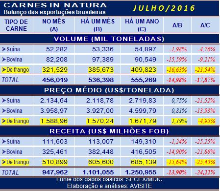 Não foi exclusividade da carne de frango o fraco resultado obtido em julho com as exportações. As carnes bovina e suína seguiram no mesmo ritmo e fecharam o mês com volume e receita cambial inferiores não só em relação ao mesmo mês do ano passado (o que tem sido rotineiro), mas também em comparação ao mês anterior, junho de 2016.