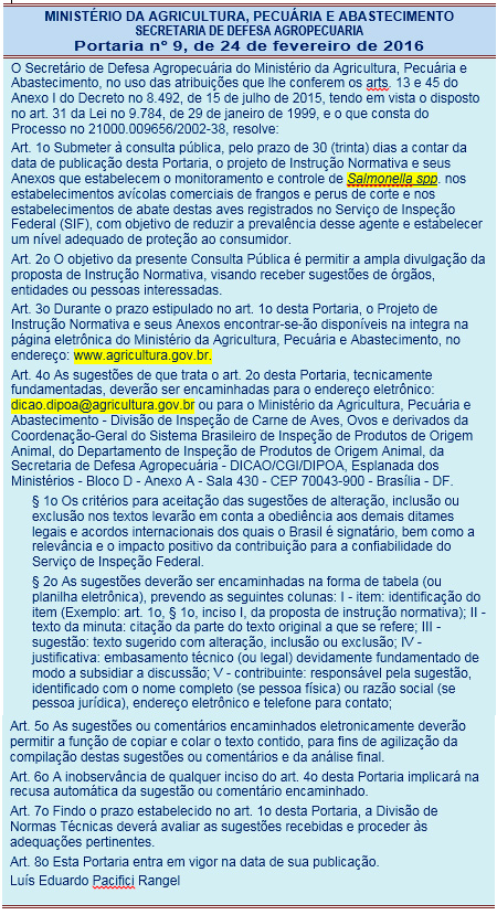 Através de portaria publicada hoje (25) no Diário Oficial da União, o Ministério da Agricultura submete a consulta pública projeto de Instrução Normativa estabelecendo novas normas para a monitoria e o controle de Salmonella spp. nas granjas e nos abatedouros de frangos e perus.