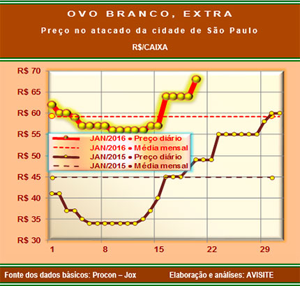 O preço médio no vigésimo dia deste ano representou aumento de 10% sobre o praticado na abertura do mês. Em 2015 representava 20%. Por ora, o preço médio do período – 20 dias – supera em mais de 50% o alcançado no ano passado. Entretanto, lá, o setor estava começando a sair daquele que foi o pior momento da avicultura de postura no decorrer de 2015.