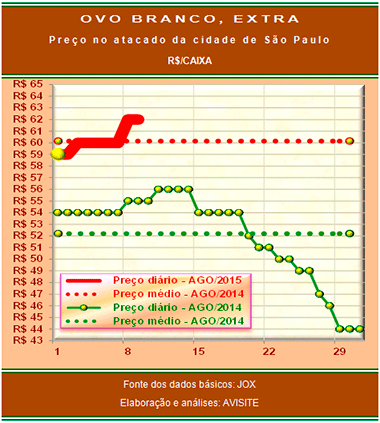 Neste último final de semana o preço médio de comercialização da caixa de ovos no mercado paulista teve nova alta – 2ª na semana e no mês, 35ª no ano – e subiu para R$62,00.