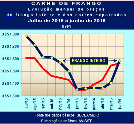 Mas isso cessou em maio de 2015 quando, pela primeira vez na história das exportações brasileiras de carne de frango, a ave inteira, não cortada, alcançou preço médio superior ao dos cortes – uma situação que persistiu nos nove meses seguintes, estendendo-se até fevereiro de 2016. Ou seja: só em março deste ano é que os cortes voltaram a apresentar valor maior que o do frango inteiro, desempenho que durou apenas três meses.