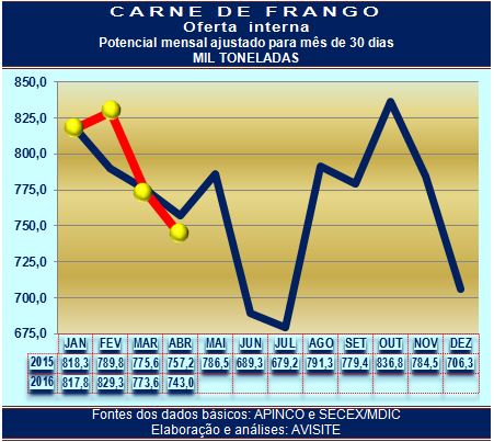 Oferta interna de carne de frango vem sendo menor que a de 2015