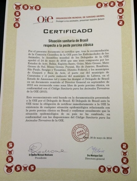 O diretor executivo da ABCS, Nilo de Sá, que também participou da Assembleia na OIE, explica o que significa a conquista para o posicionamento da carne suína brasileira no mercado internacional. “A obtenção deste certificado como zona livre evitará que o Brasil tenha restrições futuras para exportação de carne suína. Atualmente os mercados são fazem restrição quanto a esta doença, mas certamente no futuro o farão. Assim, o país precisa se antecipar antes que isso possa comprometer seus principais mercados importadores”.