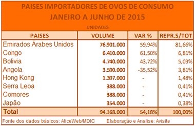 Os embarques de ovos comerciais em junho de, praticamente, 8 milhões de unidades ou, quase 667 mil dúzias, foram efetuados por três países: os Emirados, Congo e Bolívia.
