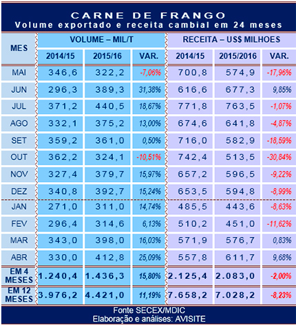 As (cerca de) 412,8 mil toneladas de carne de frango exportadas em abril representaram aumento de quase 4% sobre o mês anterior e de 25% sobre o mesmo mês do ano passado. Ficaram aquém, apenas, das 440,5 mil toneladas registradas em julho de 2015. Mas esse “aquém” foi apenas nominal, pois, considerado o número de dias úteis de um e outro mês, o volume diário embarcado em abril/16 (20 dias úteis) foi quase 8% superior ao de julho/15 (23 dias úteis).