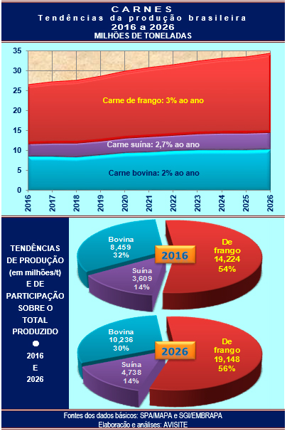 Evoluindo a uma média de 2,6% ao ano, dentro de dez anos a produção brasileira de carnes deve aproximar-se dos 35 milhões de toneladas. Então, a carne de frango – que já responde por mais da metade da produção atual – deverá corresponder a 56% do volume previsto.