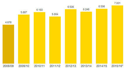 A produção total de grãos deverá atingir 210,3 milhões de toneladas na safra 2015/16. A soja lidera, com 101,2 milhões de toneladas.