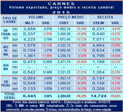 Em outras palavras, todas as demais carnes in natura e industrializadas exportadas pelo Brasil fecharam 2015 com receita cambial negativa. Ainda que somente a carne bovina in natura e os industrializados de frango tenham registrado redução também no volume.