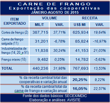 De acordo com a SECEX/MDIC, nos oito primeiros meses de 2015 o volume de cortes de frango exportado pelas cooperativas, por exemplo, aumentou perto de 38%, enquanto o de industrializados registrou incremento superior a 30%.