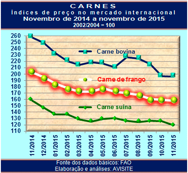 É interessante observar que, por aqui (isto é, nas exportações brasileiras de carne de frango), tem prevalecido a percepção de que os preços recebidos vêm recuando em função da desvalorização do real. No entanto, comparando-se o recuo apontado pela FAO com os registrados nas exportações brasileiras, observam-se índices de redução muito próximos.