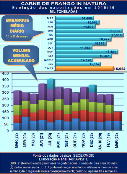 Como era esperado, da primeira para a segunda semana de março os embarques de carne de frango in natura sofreram redução, passando de 18,770 mil toneladas/dia para 14,957 toneladas/dia.