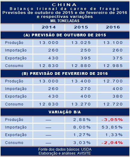 Revendo projeções divulgadas há menos de seis meses (outubro de 2015), o Departamento de Agricultura dos EUA indica que a produção chinesa de carne de frango de 2016 corre o risco de recuar ao menor nível dos últimos seis anos, o que, por sua vez, pode aumentar em quase 50% as importações do produto. Tudo como resultado da Influenza Aviária.